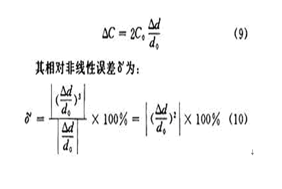 這時電容器的變化量ΔC才近似地和位移Δd成正比。其相對非線性誤差為: