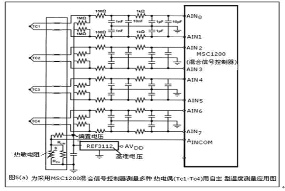 圖5(a)為采用mscl200的多熱電偶用自主型溫度測量應用圖。該溫度測量電路采用混合信號控制器mscl200來測量四種不同類型的熱電偶(tc1-tc4)的差分輸出電壓和參考溫度。