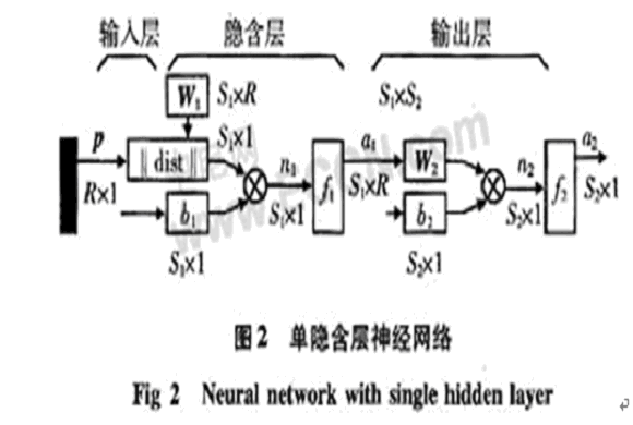 其中,p為輸入矢量,R為輸入矢量維數(shù),S1為隱含層神經(jīng)元個數(shù),S2為輸出層神經(jīng)元個數(shù),W1為隱含層神經(jīng)元權(quán)值矩陣,W2為輸出層權(quán)值矩陣,b1為隱含層神經(jīng)元閥值,b2為隱含層神經(jīng)元閥值,n1為隱含層輸入節(jié)點,n2為輸出層節(jié)點。f1為S型函數(shù),f2為purelin型函數(shù)。神經(jīng)網(wǎng)絡(luò)算法是用于前饋多層網(wǎng)絡(luò)的學(xué)習(xí)算法。如果輸出不能得到期望的輸出,則轉(zhuǎn)入后向傳播。通過誤差的后向傳播調(diào)整各層之間的權(quán)系數(shù)。反復(fù)輸入樣本序列,直至權(quán)系數(shù)不在改變?yōu)橹梗敵稣`差在規(guī)定的范圍之內(nèi)。算法采用如下改進:1)采用模擬退火法以克服局部最小;2)用奇函數(shù)作激勵函數(shù)和傳播過程中采用新誤差傳播因子完善該算法收斂性問題。