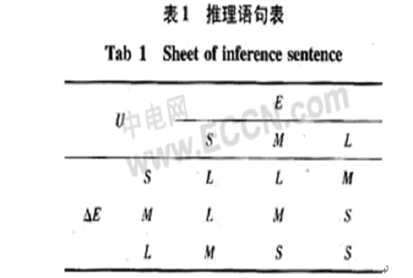 基于神經(jīng)網(wǎng)絡(luò)在推理方面不足,故借助于模糊控制強大的推理功能,提取有效的條件語句,進而加快網(wǎng)絡(luò)的訓(xùn)練速度。選取偏差E和偏差變化率△E作為輸入和控制量U作為輸出。偏差E和偏差變化率△E的模糊量分別為大(L),中(M),小(S),創(chuàng)立描述條件推理表格如表1。