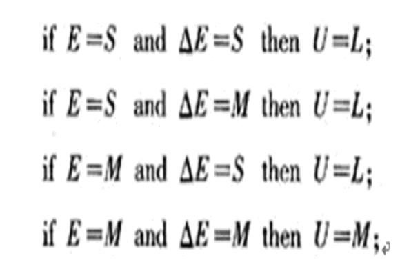 橫行元素表示E的模糊量,豎行表示△E的模糊量,兩者交叉為控制量U的模糊量。根據(jù)表中數(shù)據(jù),可知共有3×3種推理語句,采用推理法將條件語句表簡化得出以下4條語句: