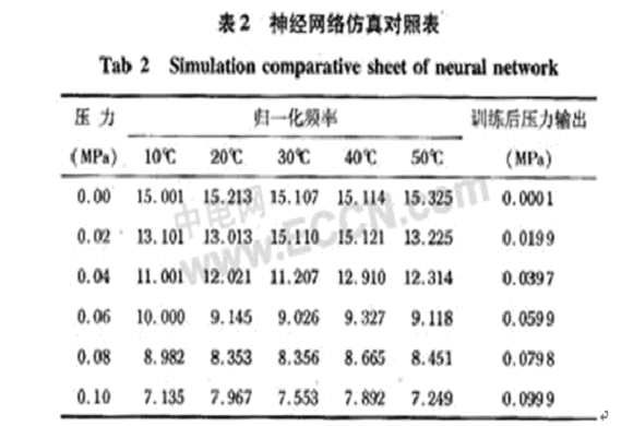 境下進行神經(jīng)網(wǎng)絡(luò)的訓(xùn)練和仿真,通過神經(jīng)網(wǎng)絡(luò)工具箱,編制相應(yīng)的仿真訓(xùn)練程序,實現(xiàn)仿真過程。在仿真時,隨機選取幾組頻率-溫度作為輸入,最后,進行標(biāo)定壓力值和仿真結(jié)果的比較。仿真數(shù)據(jù)結(jié)果如表2。
