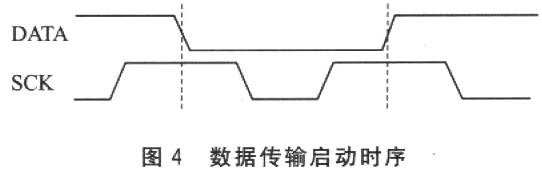 微處理器和溫濕度傳感器通信采用串行二線接口SCK和DATA,其中SCK為時鐘線,DATA為數據線。該二線串行通信協議和I2C協議是不兼容的。在程序開始,微處理器需要用一組“啟動傳輸”時序表示數據傳輸的啟動,如圖4所示。當SCK時鐘為高電平時,DATA翻轉為低電平;緊接著SCK變為低電平,隨后又變為高電平;在SCK時鐘為高電平時,DATA再次翻轉為高電平。