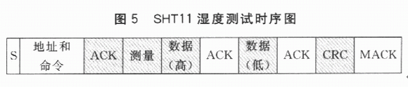 SHTll濕度測試時序如圖5所示。其中,陰影部分為SHTll控制總線。主機發出啟動命令,隨后發出一個后續8位命令碼。該命令碼包含3個地址位(芯片設定地址為000)和5個命令位;發送完該命令碼,將DATA總線設為輸入狀態等待SHTll的響應;SHTll接收到上述地址和命令碼后,在第8個時鐘下降沿,將DATA下拉為低電平作為從機的ACK;在第9個時鐘下降沿之后,從機釋放DATA(恢復高電平)總線;釋放總線后,從機開始測量當前濕度,測量結束后,再次將DATA總線拉為低電平;主機檢測到DATA總線被拉低后,得知濕度測量已經結束,給出SCK時鐘信號;從機在第8個時鐘下降沿,先輸出高字節數據;在第9個時鐘下降沿,主機將DATA總線拉低作為ACK信號,然后釋放總線DATA;在隨后8個SCK周期下降沿,從機發出低字節數據;接下來的SCK下降沿,主機再次將DATA總線拉低作為接收數據的ACK信號;最后8個SCK下降沿從機發出CRC校驗數據,主機不予應答(NACK)則表示測量結束。