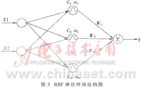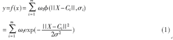 上式中,m是隱含層結點數;||•||是歐幾里德范數;X,Ci∈Rn, ωi是第i個基函數與輸出結點的連接權值(i=1,2,...,m)。