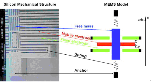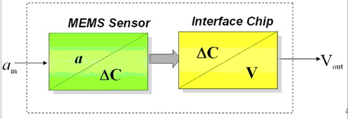 在電容式的結構中,當其中的質塊出現加速度運動時,就會產生電容量的差異變化(DC),此變化會傳送給另一顆接口芯片(Interface chip),由它來輸出可量測的電壓值。因此,一個3軸加速度計芯片中必須包含兩大單元,一是單純的機械性MEMS傳感器,它包含測量XY軸的區域及測量Z軸的區域,內部有成群移動的電子;另一則是標準的ASIC接口芯片,它會將電容變化轉換為電壓訊號輸出。