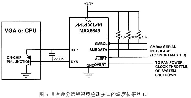 圖5為筆記本電腦普遍使用的一種溫度控制方案。溫度傳感器IC通過SMBus接口連接到筆記本電腦的嵌入式微控制器,由于溫度傳感器IC與嵌入式微控制器之間為數(shù)字接口,因此溫度傳感器IC在位置上可以遠離嵌入式微控制器而不會有噪聲干擾問題。MAX6649同時內(nèi)置一個本地溫度傳感器和用于連接遠端二極管的差分接口。MAX6649的IDH=100uA,IDL=10uA,高精度、小電流的電流源可減小因雜散電阻所產(chǎn)生的測量誤差。差分輸入有助于降低噪聲干擾。圖5所示電路,溫度傳感器IC只負責溫度檢測,風扇轉(zhuǎn)速控制由嵌入式微控制器完成,由軟件實現(xiàn)。為了避免軟件控制的死機問題,MAX6649還集成了保護功能,當溫度到達第一個高溫臨界點時,MAX6649 ALERT可發(fā)出中斷請求,要求嵌入式微控制器進行相應的處理,例如對處理器進行降頻;如果上述對策仍無法有效抑制溫度的上升,當溫度達到第二高溫臨界點時,MAX6649 OVERT可以用來控制系統(tǒng)的第二個風扇或?qū)ο到y(tǒng)進行強制關(guān)機。圖5具有低成本、高精度、使用彈性大等優(yōu)點,但在軟件的設(shè)計上需花費較多的功夫。