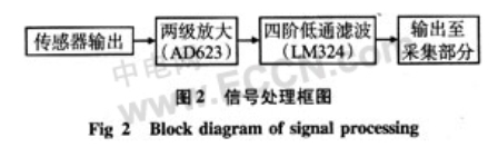 前端信號處理電路由儀表放大器、四階巴特沃思低通濾波器等部分構成,其基本框圖如圖2所示。