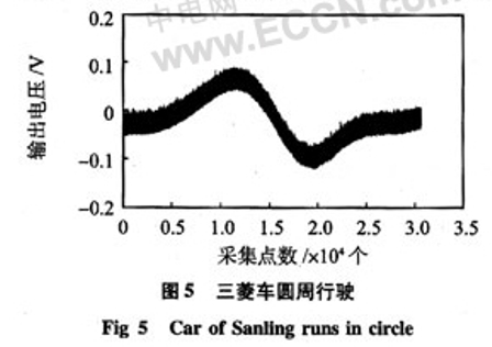直線法和圓周法比較可以看出:圖5、圖3、圖4中的曲線變化規律明顯不同,曲線形狀變化較大是因為目標運動方式不同,即影響磁場的方式不同,從而測得曲線有差別,圖5曲線中有個較大的峰值,是因為車在圓周行駛時,在采集信號期間車有一次通過傳感器敏感軸的正方向。另外,由于采集時間有限,所以,曲線沒有反映信號周期性變化,若采集時間達到2個周期,則會出現2個主峰。