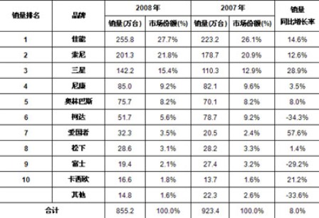 而美國(guó)品牌柯達(dá)的市場(chǎng)地位進(jìn)一步下滑。國(guó)內(nèi)品牌愛(ài)國(guó)者則通過(guò)其價(jià)格優(yōu)勢(shì)、品牌宣傳和一些行業(yè)市場(chǎng)的地位,從2007年銷(xiāo)量市場(chǎng)第9名的位置,迅速提升到2008年市場(chǎng)第7名的位置,并成功超越三大日系品牌松下、卡西歐和富士。