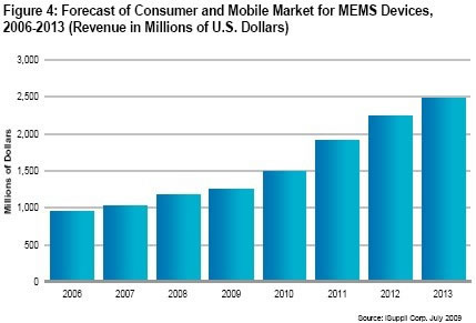 圖4所示為iSuppli公司對于面向無線與消費電子應用的全球MEMS營業收入的預測。