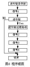 根據(jù)光檢測(cè)電裝置的工作過程,只要現(xiàn)場(chǎng)測(cè)定送引錠過程中各個(gè)光電信號(hào)發(fā)生的時(shí)間,結(jié)合送引錠過程與光電信號(hào)的關(guān)系,利用PLC應(yīng)用程序中的相關(guān)數(shù)據(jù),編制符合要求的PLC程序,將PLC程序輸出信號(hào)輸入至PLC的輸入模塊,替代原光電信號(hào)的輸入信號(hào)。其程序框圖如圖6所示。