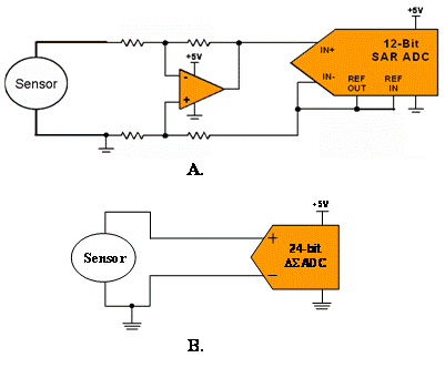 24 位Δ-Σ (B) 顯示的是一個直接連接至轉(zhuǎn)換器的傳感器。