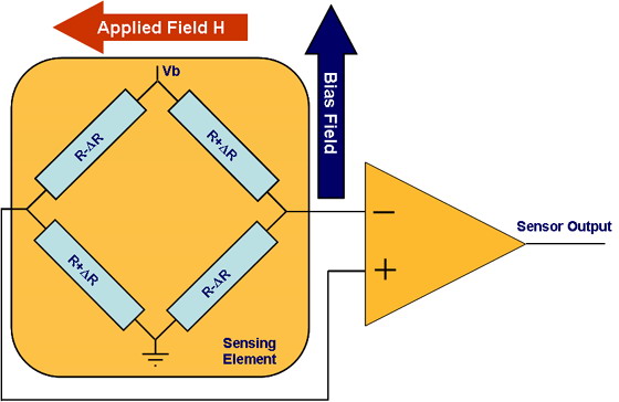 當(dāng)在一個很薄的鐵條上施加磁力線方向與經(jīng)過鐵條的電流方向垂直的磁場時,鐵條內(nèi)的電阻就會發(fā)生變化。這種傳感器通常采用單臂電橋形式,如圖所示,電橋由靜態(tài)阻值相同的磁阻構(gòu)成。在測量過程中,電橋上施加電壓Vb,使電流通過電阻。只要磁場H存在,在兩組四個相反放置的電阻器中,第一組兩個電阻的磁化矢量轉(zhuǎn)向電流,使電阻值變大;而另兩個電阻的磁化矢量背離電流,使電阻值變小。在線性范圍內(nèi),傳感器輸出與所施加的磁場強(qiáng)度成正比。