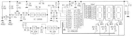 電路原理見附圖。電路由傳感器電路、信號放大和整形電路、單片機電路、數碼顯示電路等四部分組成。