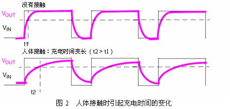 如圖1(a)所示,在RC網(wǎng)絡(luò)施加周期性充電電壓Vin,測量Vout會得到如(b)的時序,通過檢測充電開始到Vout到達(dá)某一門限值的時間tc的變化,就可以判斷出是否有人體接觸。圖2顯示出有人體接觸時充電時間會變長。