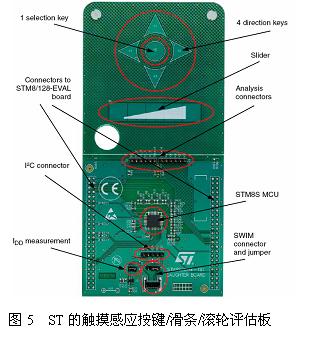 ST公司設(shè)計了完整的基于RC充電檢測的電容式感應(yīng)觸摸方案的完整設(shè)計,包括PCB和完整的源程序,以及基于STM8S的標(biāo)準(zhǔn)觸摸感應(yīng)庫(TouchSenseLibrary:TSL)和應(yīng)用API接口,采用易于移植的C設(shè)計,用戶可以方便地應(yīng)用于其他任何MCU系統(tǒng)中。因為RC充電理論涉及的專利已經(jīng)對公眾開放,所以完全沒有專利的限制。