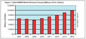 iSuppli公司,手機和消費電子產業對于感測器和激勵器的需求,將幫助全球MEMS市場在2010年強力回升,結束之前兩年的下滑局面。