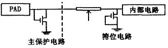 防護ESD的一種有效方法,即設計特定的保護電路。圖10即為一種基于CMOS工藝的IC卡芯片ESD保護電路7。該結構包括兩個部分:主保護電路和箝拉電路。在ESD發生時,箝拉電路首先導通,使輸入端柵上的電壓箝拉在低于柵擊穿的電壓。中間的串聯電阻起限流作用,更重要的是使PAD上的電壓能觸發主保護電路的開啟,使ESD能量通過主保護電路得到釋放。
