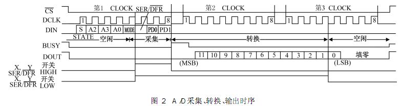 如圖 1示。ADS7843串行接口的一次完整操作需要 3× 8=24個 DCL K時鐘周期,前 8個脈沖接收 8位的命令,并在第 6個脈沖的上升沿開始 A / D轉換器進入采樣階段,從第 9個脈沖開始進入轉換階段,輸出12位采樣值,轉換結束進入空閑階段。直到 24個DCL K結束,CS置高電平,一次測量結束。如圖 2所示。此外,ADS7843還支持其他的工作方式,這里不再詳述。