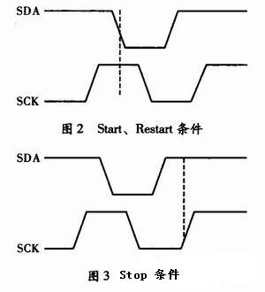 Start和Stop條件:主機通過發送Start條件啟動通信,Start、Repeated Start條件如圖2所示,Stop條件如圖3所示。