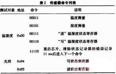 (2)地址與測試對象命令。該命令包含3個地址位和5個命令位,其后為應答ACK位,表示SHT11正確收到命令。傳感器命令列表,如表2所示。