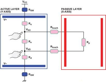 連接直流電壓的層稱(chēng)為“有源”層,電流與其阻抗成反比。測(cè)量電壓的層稱(chēng)為“無(wú)源”層,無(wú)相關(guān)電流流經(jīng)該層。發(fā)生單點(diǎn)觸摸時(shí),在有源層中形成一個(gè)分壓器,無(wú)源層電壓測(cè)量通過(guò)一個(gè)模數(shù)轉(zhuǎn)換器讀取與觸摸點(diǎn)和負(fù)電極之間的距離成比例的電壓1.