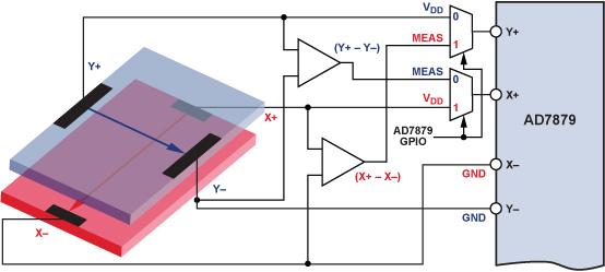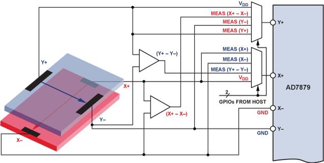 在前半周期中,將一個(gè)直流電壓施加于上層(有源層),并測(cè)量X+引腳的電壓(對(duì)應(yīng)于VY+ – VY–),以提供與Y方向上的運(yùn)動(dòng)(接近還是分開(kāi))相關(guān)的信息。