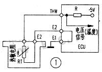 安裝好冷卻液溫度傳感器,將傳感器的連接器插好。當(dāng)點(diǎn)火開關(guān)置于 ON 位置時(shí),測量圖 1 中連接器“ THW ”端子 ( 豐田車 ) 或 ECU 連接器“ THW ”端子與 E2 間輸出電壓。所測得的電壓應(yīng)與冷卻液溫度成反比變化。