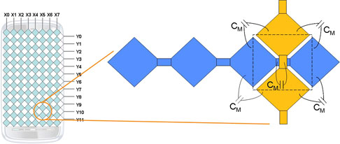電容感測含有數個層:頂層是玻璃或塑膠材質,接者依序是一個光學透明膠(OCA)層、觸控感測器及平面液晶顯示器(LCD)。觸控感測器是由許多感測元件所排列而成的網格,尺寸通常為5毫米×5毫米。