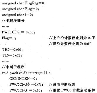 VRS51L3074單片機是由美國Ramtron(瑞創(chuàng))公司推出的8位單片機家族VRS51L3XXX系列的成員。VRSS1L3074提供了2個與定時器0和1關(guān)連的獨立的脈寬計數(shù)器(PWC)模塊,用戶可通過對PWC模塊和定時器的配置,靈活地控制定時器啟動或停止計數(shù),從而方便地實現(xiàn)對ADXL202E輸出的脈寬和周期的計數(shù)。