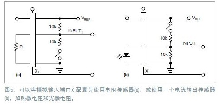 模擬輸入架構(gòu)能夠直接連接多種類型的傳感器。例如,可以在接地端與輸入端之間連接熱敏電阻或光敏電阻,并接通上拉電阻,構(gòu)成一個(gè)分壓器;片上的ADC可以直接對(duì)這個(gè)分壓器的輸出做數(shù)字化(圖5)。這種方案還采用了比率工作方式,意味著ADC使用與分壓器驅(qū)動(dòng)電壓相同的電壓基準(zhǔn)。電流輸出傳感器也可以像光電二極管那樣連接,即直接連到接地端與輸入端之間。切換到下拉電阻,使光電流能產(chǎn)生一個(gè)電壓。