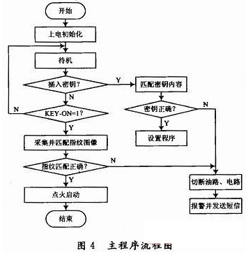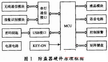 主要工作原理如下:車主停車熄火后,防盜器進入鎖定狀態。此時如果汽車鑰匙不在ON位,就不能進行指紋識別;只有當汽車鑰匙在ON位,才可用指紋識別解鎖防盜器并自動點火。在鎖定狀態下,汽車的油路、電路等被切斷,汽車鑰匙無法點火;如果強行剪斷指紋采集模塊和控制盒的連線,或者不識別指紋而強行用汽車鑰匙點火,汽車會通過鳴號、閃燈和無線通信網絡報警。在鎖定狀態插入密碼鑰匙可進入解鎖狀態,并可根據LCD和語音提示通過小鍵盤進行指紋注冊/刪除、手機號碼設置和應急點火等操作。