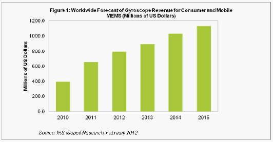 據IHS iSuppli公司的MEMS市場追蹤報告,由于蘋果iPhone和iPad去年第四季度創出最高銷量紀錄,2011年陀螺儀成為消費與移動MEMS領域中的創收大戶。