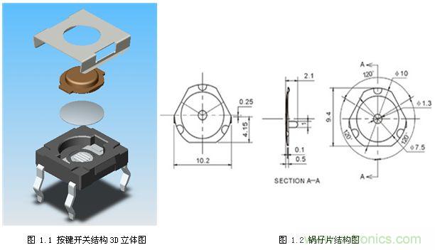開(kāi)關(guān)分為輕觸開(kāi)關(guān)、滑動(dòng)開(kāi)關(guān)、多向開(kāi)關(guān)、按鍵開(kāi)關(guān)、感應(yīng)開(kāi)關(guān)、撥碼開(kāi)關(guān)等,種類異常繁多,在各個(gè)領(lǐng)域里各施其職。本文主要討論的是針對(duì)按鍵開(kāi)關(guān)的荷重位移曲線儀,所以下面重點(diǎn)說(shuō)說(shuō)按鍵開(kāi)關(guān)的結(jié)構(gòu)原理。如圖1.1按鍵開(kāi)關(guān)結(jié)構(gòu)3D立體圖所示,從上到下的構(gòu)件分別為:第一個(gè)是金屬固定架,材質(zhì)一般為不銹鋼,作用是固定好按鍵帽與圓形金屬?gòu)椘ㄒ步绣佔(zhàn)衅?;第二個(gè)是按鍵帽,材質(zhì)一般為塑料,作用是方便按鍵動(dòng)作的操作,只需在上面一按開(kāi)關(guān)即可閉合;第三個(gè)是按鍵開(kāi)關(guān)結(jié)構(gòu)里面最重要的構(gòu)件,叫金屬?gòu)椘ㄒ步绣佔(zhàn)衅?,一個(gè)按鍵使用的壽命的長(zhǎng)短和質(zhì)量的好壞都與鍋?zhàn)衅兄苯雨P(guān)系,目前的金屬?gòu)椘鶕?jù)其形狀主要分為四大類:圓形、十字形/四角、三角形和腰圓/橢圓,直徑從3mm,4mm,5mm等常規(guī),同時(shí)也有各種特殊規(guī)格如十字形7mm、14mm、20mm等,力度從80克到500克。圖1.2所示的是三角形鍋?zhàn)衅慕Y(jié)構(gòu)圖。圓形鍋?zhàn)衅ń饘購(gòu)椘┦亲钇毡榈膹椘_(kāi)關(guān),按通用材質(zhì)分為兩種:不銹鋼(SUS301/SUS304)和磷青銅(單面附銀)。目前最小可以做到3MM,最大可以做到12MM,其他常用直徑為:3mm-12mm。力度可做到80G-500G。因其結(jié)構(gòu)較為規(guī)則,產(chǎn)品在沖壓過(guò)程中受破壞性比較小,因此壽命能夠達(dá)到較為理想狀態(tài)(100萬(wàn)次)。