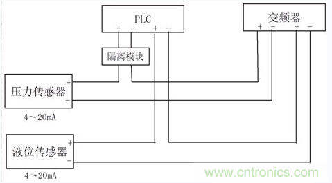 對于傳感器輸出的電流信號,只經PLC和變頻器的輸入阻抗之和不大于傳感器的輸出負載阻抗即可,壓力傳感器的信號可以同時串入PLC和變頻器,如只有壓力傳感器信號,則PLC和變頻器也都可以正常接收壓力傳感器的信號。而當液位傳感器的信號也同時接入PLC和變頻器時,因PLC接收信號的-端都在變頻器的+端,當兩傳感器的信號電流不一樣時,就有可能使PLC兩-端的電位有較大的差異,就就形成了共模干擾電壓。如PLC輸入端又互相不是隔離的,則會造成PLC的模擬信號輸入端接收不正常。變頻器的兩輸入信號是在PLC的后面,其-端電位可保持在變頻器內部電路設定的狀態,問題不大。