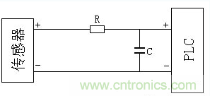 傳感器到PLC(或其它控制器)去的弱電信號,可采用阻容濾波的方法減少干擾,如下圖所示。