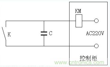 由于開關K離接觸器KM較遠,兩根電線很長導致其分布電容C將變得很大,在交流電路中,這個分布電容中將有位移電流流過,即使開關K斷開也可能因KM維持能量不需太大而導致KM不釋放,設備停不下來,此時,可以按以下方法解決: