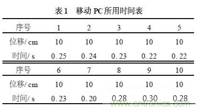 現在通過簡單實驗獲取數據來計算人為移動引起的az :隨意從桌上拿起筆記本,重復10次,記錄短距離10 cm)所用時間。得到10組數據如表1所示。