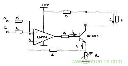 由圖1可見,電路主要元件為一運算放大器LM324和三極管BG9013及其他輔助元件構成,V0為偏置電壓,Vin為輸入電壓即待轉換電壓,R 為負載電阻。其中運算放大器起比較器作用,將正相端電壓輸入信號與反相端電壓V-進行比較,經運算放大器放大后再經三極管放大,BG9013的射級電流Ie作用在電位器Rw上。