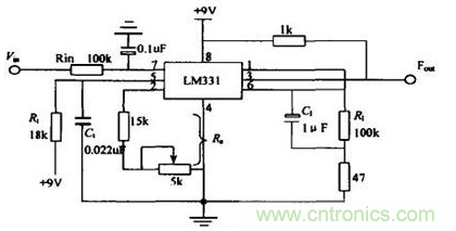 電阻Rs、R1、Rt和電容Ct直接影響轉換結果Fout,因此對元件的精度要有一定的要求,可根據轉換精度適當選擇,其中Rt、Ct、Rs、R1要選用低溫漂的穩定元件,Cin可根據需要選擇0.1uF 或1uF 。電容C1對轉換結果雖然沒有直接的影響,但應選擇漏電流小的電容器。電阻R1和電容C1組成低通濾波器,可減少輸入電壓中的干擾脈沖,有利于提高轉換精度。電路中的47Ω 電阻對確保電路線性失真度小于0.03% 是十分必須的。
