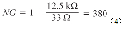 電阻R4使跨導放大器的噪聲增益保持在合理水平。R4的值需權衡兩個因素:噪聲增益的幅度和暴露于高濃度氣體時傳感器的建立時間誤差。對于本電路,R4 = 33 Ω,由此可計算噪聲增益等于380,如公式4所示。