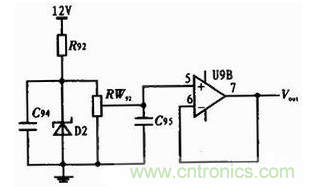 圖1中D2為穩壓管,9V電源選用額定擊穿電壓為9.1 V的1N4696,1 V電源選用額定擊穿電壓為1.2 V的LM385;RW92是電位器,和穩壓管并聯起到分壓的作用,滑動頭分別可得到9 V和1 V的電壓;運放在這里是電壓跟隨器,輸出電壓和電位器滑動頭處的電壓大小相等;R92是限流電阻,和穩壓管串聯;兩個電容是退耦電容,大小0.1 μF,起到穩定電壓的作用。為了不影響穩壓管工作電阻阻值不大于500 Ω,電阻功率不小于1 W。電位器阻值不小于10 kΩ。