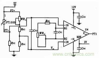圖4中WR41是調零電位器;電橋的輸出直接連接運放AD623,其連接和調節增益方法和上節中相同這里不再介紹。調試時PT1000用電阻箱實現的,阻值由分度表獲得的。