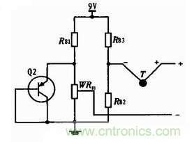 本設計采用晶體管PN結溫度特性進行冷端補償,冷端補償電路和熱電偶串聯,如圖5所示。圖中T為熱電偶,其他為冷端補償電路,晶體管選用三極管9012,其電壓溫度變化率約為-2.1 mV/℃,3個電阻、電位器和PNP三極管組成電橋。當冷端溫度升高時,PN結壓降降低,WR81滑動頭電勢降低,WR82和R83中間電勢不變,電橋輸出增大,補償了熱電偶冷端的溫漂,當溫度降低則相反。電路的輸出直接連在運放AD623的輸入端。