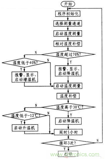每次測得的數據要和規定值進行比較,如果在允許的范圍內,則程序進行下一步操作,如果不滿足要求.則應報警并將此刻的數據值顯示出來,在每次循環結束后。要經過1個小時(可以靈活選用)的延時.這主要是因為彈藥倉庫里有很多木制結構,揮發和吸收水分都有一個過程,經過一定延時再進行測量.可以避免傳感器長時間的工作和執行機構的反復啟停,節約資源,同時可以延長系統的使用壽命。每經過3次(根據需要可以適當選擇)循環測量后,單片機控制打印機將3次測量的溫/濕度數據打印出來,便于報表和存檔。
