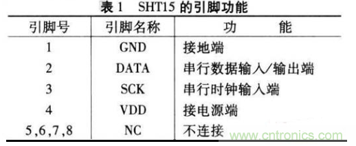 SHT15的引腳比較少.使用方便。其引腳排列如圖2所示。引腳功能如表1所示。SHT15型智能傳感器的相對濕度測量范圍是0~100%。分辨率達0.03%,最高精度為+2%RH,溫度測量范圍是—40℃一十123.8℃.分辨率為0.1℃.電源電壓范圍是+2.5V一+5.5V.響應時間小于3s。