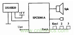 綜上所述,整體硬件電路組成如圖1所示,由SCPE061A單片機(jī)實(shí)現(xiàn)系統(tǒng)整體控制并實(shí)現(xiàn)語音或鍵盤編程與語音播報(bào),系統(tǒng)可通過通用異步串行接口實(shí)現(xiàn)聯(lián)網(wǎng)功能,在不需要聯(lián)網(wǎng)的場合,溫度計(jì)也可以單獨(dú)使用,實(shí)現(xiàn)了系統(tǒng)的可裁剪,DSl8B20用來實(shí)現(xiàn)溫度檢測。