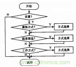 可設(shè)置的參數(shù)主要有,播報(bào)方式:“連續(xù)、隔x秒、禁止”;報(bào)警溫度值;工作方式等。在需要實(shí)時(shí)關(guān)注溫度值的時(shí)候,可以設(shè)置為連續(xù)播報(bào);溫度變化較慢的時(shí)候可以設(shè)置為隔x秒方式;夜晚設(shè)置報(bào)警模式后,可以設(shè)置為禁止播報(bào)模式。設(shè)置報(bào)警溫度值后可以,可以處理其他事情,在出現(xiàn)警情時(shí),系統(tǒng)給出報(bào)警,提示用戶。選擇工作方式為“聯(lián)網(wǎng)工作”后,系統(tǒng)除了現(xiàn)場播報(bào)和報(bào)警外,還將相應(yīng)信息通過異步串行口發(fā)送到遠(yuǎn)端。設(shè)置過程全部采用語音菜單方式,可以大幅度較低成本,設(shè)置流程圖如圖2所示。