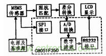 設計中采用C8051F350的24位Sigma-Delta模/數轉換器作系統信號的模數轉換,SPI接口作MEMS傾角傳感器的溫度采集,以實現對傳感器的溫度補償,UART作串行LED顯示接口。為保證模/數轉換器工作穩定,采用外部基準源。